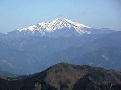 頂上は、暖かい春の日差しがサンサンと降り注ぎ雲一つない日本晴れ。 花崗岩の大きな岩が露出した頂上は見晴らしが抜群で、御嶽山が眼前に迫り、 中央アルプスや南アルプスの山並みがクッキリと浮かぶ。やや離れて、形が 良くて一際目立つ山がデンと座っている。この山がなんと、恵那山とのこと。 普段見慣れている台形の恵那山とは似ても似つかない山容に、他の山の名前 をあれこれ想像してしまう。この方角から見る恵那山なら日本百名山の名に 恥じない立派な山である。しばし見とれる。